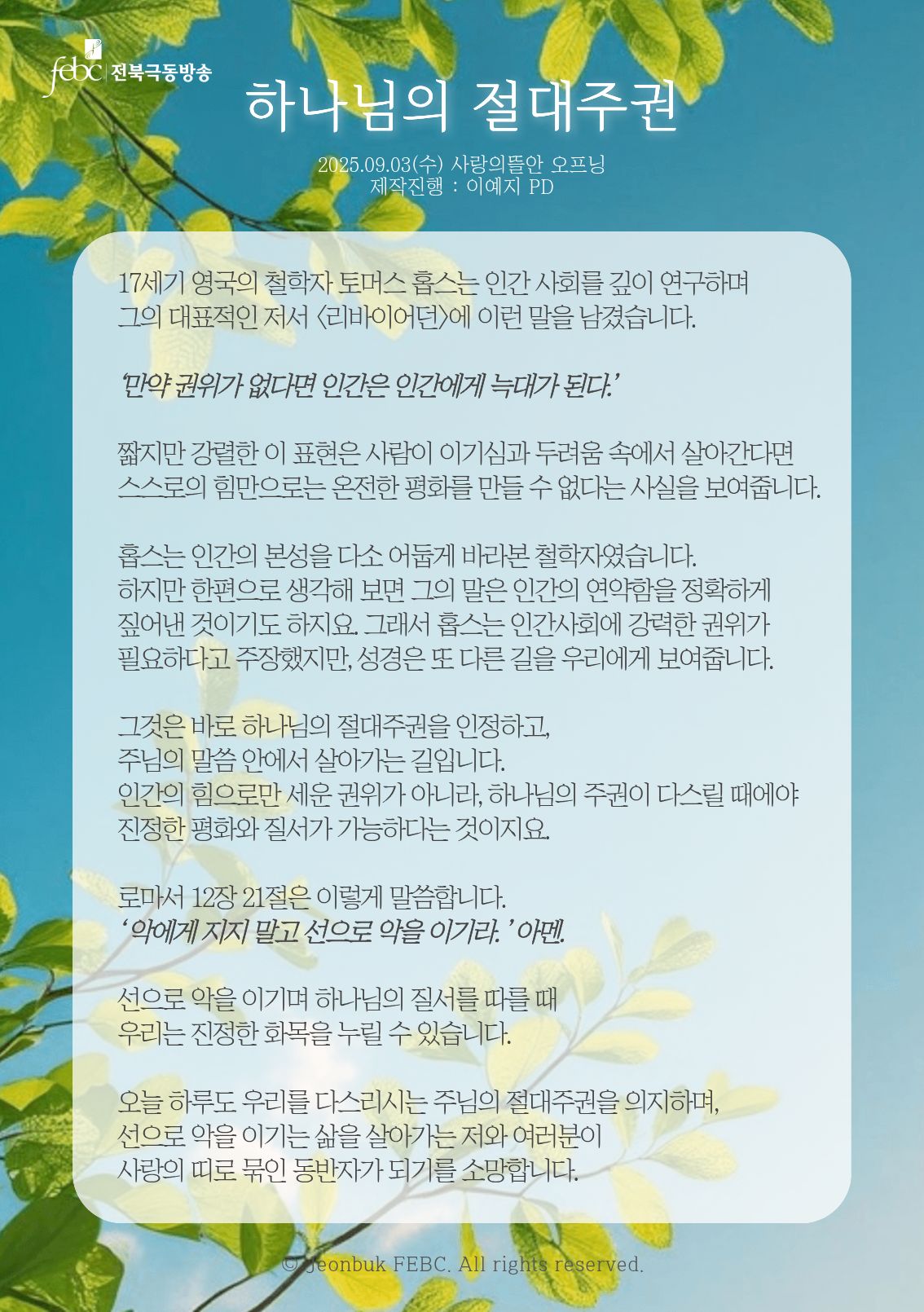 [전북] 25.09.03(수) 사랑의뜰안 오프닝 "하나님의 절대주권"