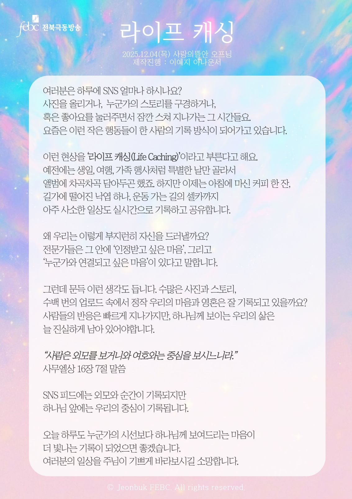 [전북] 25.12.04.(목) 사랑의뜰안 오프닝 "라이프 캐싱"